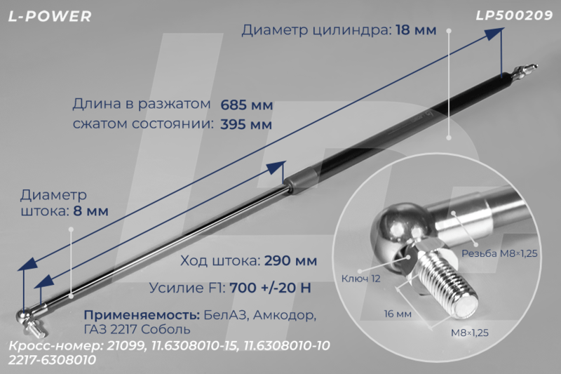 Lмакс=685мм, Lмин=388мм, F1=700Н, Dцил=18мм, dшт=8мм. Тип крепления — шарниры